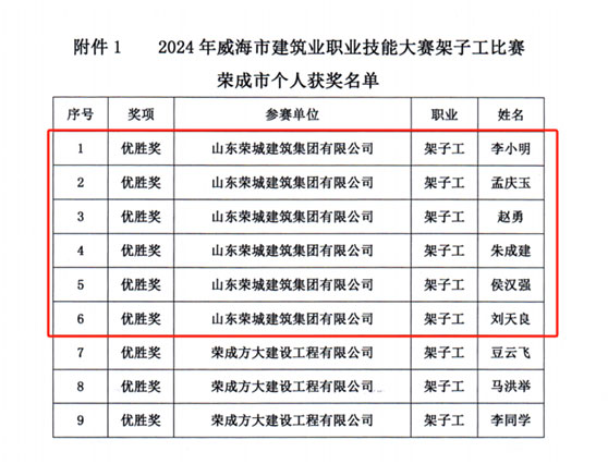 2024年6月21日,由威海市人力資源和社會保障局、威海市總工會、威海市住房和城鄉建設局主辦,威海市建筑工程服務中心、臨港區住房和城鄉建設局、威海市建筑業協會承辦的2024年度威海市建筑業架子工職業技能大賽在環翠區萬禾書院項目部舉行。比賽現場,23支隊伍的69名參賽選手穿著整齊的工作服,頭戴安全帽,身著工服,精神飽滿,動作嫻熟,有條不紊的進行一系列工藝操作,展示著扎實的專業功底和豐富的技能經驗。經過數小時的激烈角逐,我司架子工代表李小明、孟慶玉、趙勇、朱成建、侯漢強、劉天良獲得優勝獎,公司獲得團體三等獎的好成績。